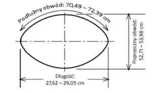 - Powinna być nowa lub prawie nowa o eliptycznym kształcie (zgodnym z rysunkiem przedstawionym poniżej). Prawie nowa piłka to taka, która zachowuje właściwości i jakość nowej piłki oraz nie była naprawiana lub modyfikowana.