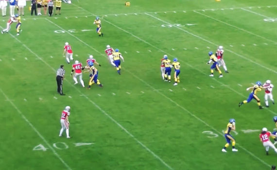Frank Kristensen, koordynator sędziów w IFAF Europe, omawia sytuacje z nieuprawnionym zawodnikiem poza strefą neutralną w akcji z podaniem do przodu.